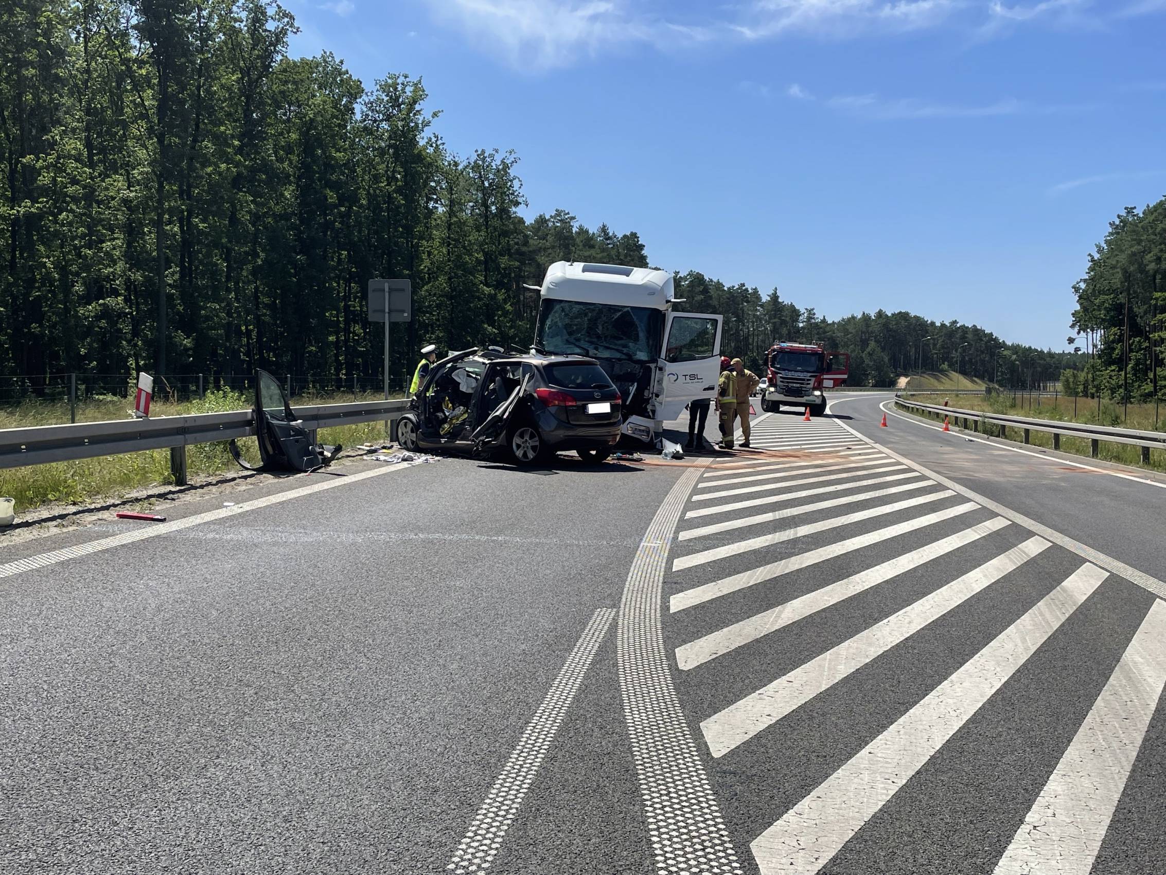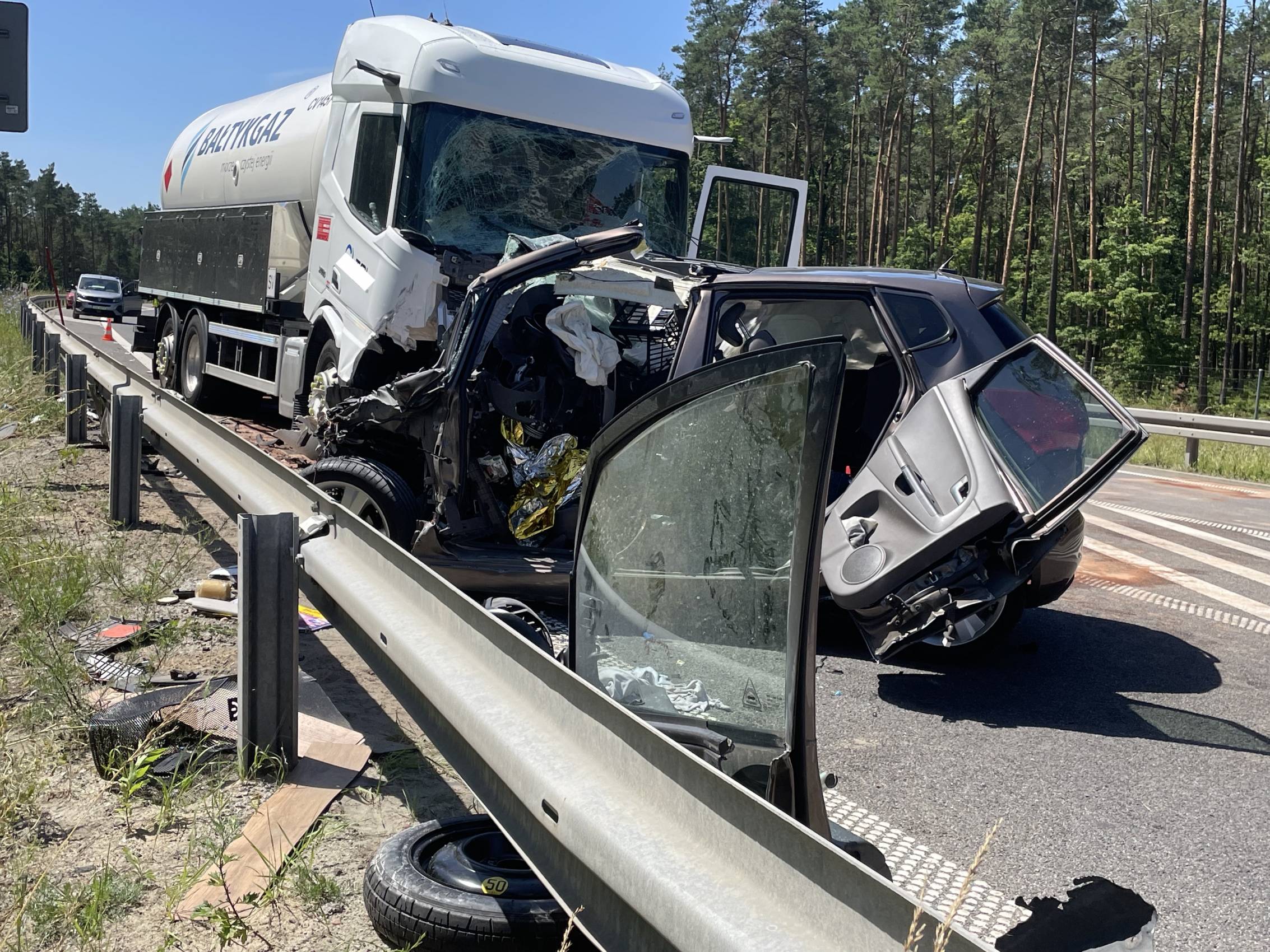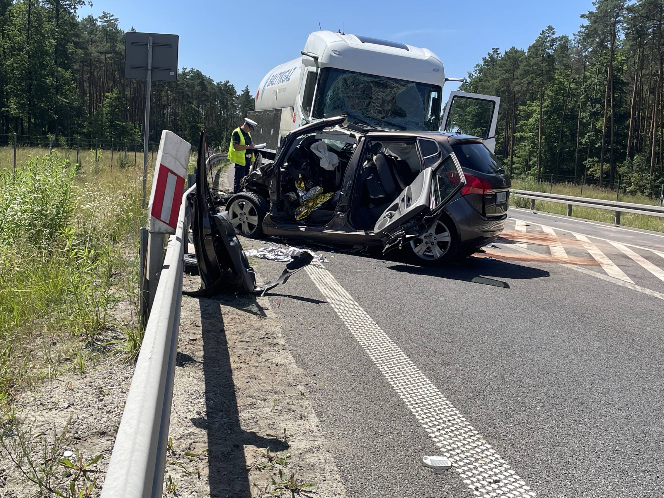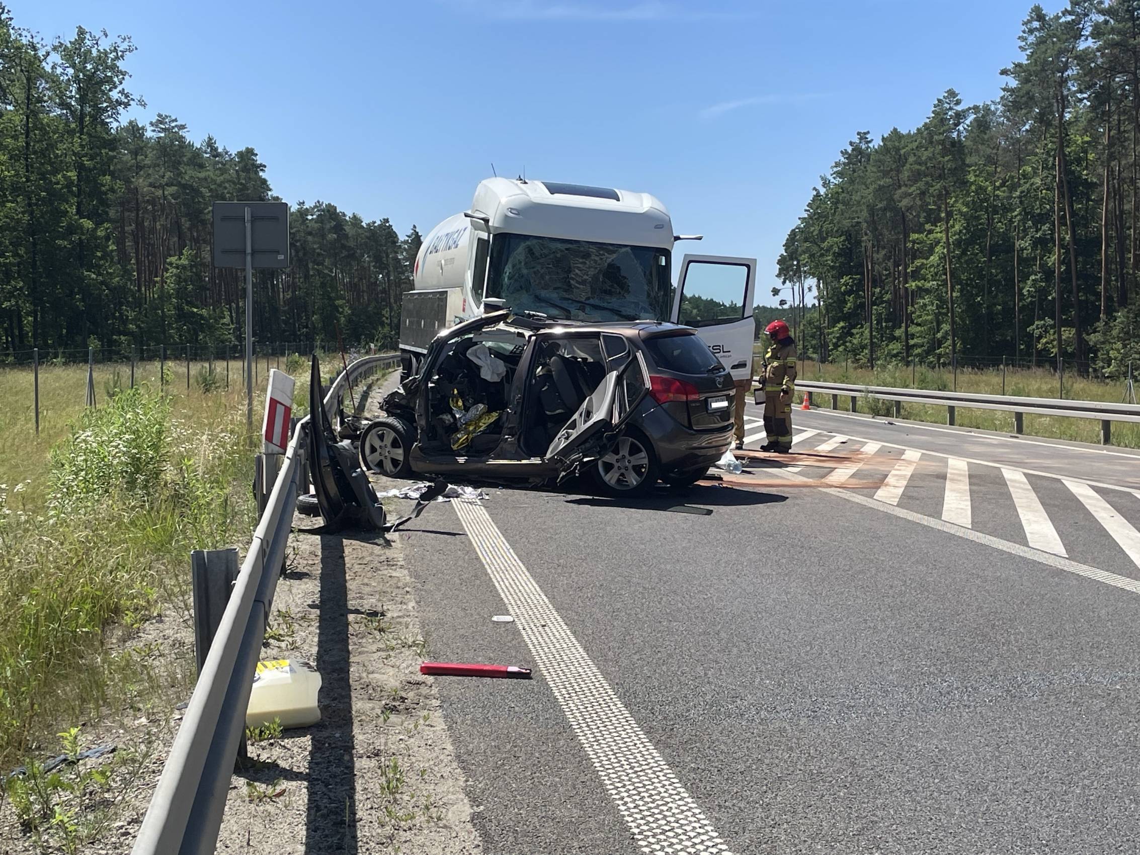 Do zdarzenia doszło w poniedziałek, 30 czerwca tuż przed godziną 10.00 rano. Wstępnie wszystko wskazuje na to, że kierujący samochodem osobowym Kia, zjechał na przeciwległy pas ruchu, wówczas doszło do czołowego zderzenia z ciągnikiem siodłowym przewożącym ładunek gazu.