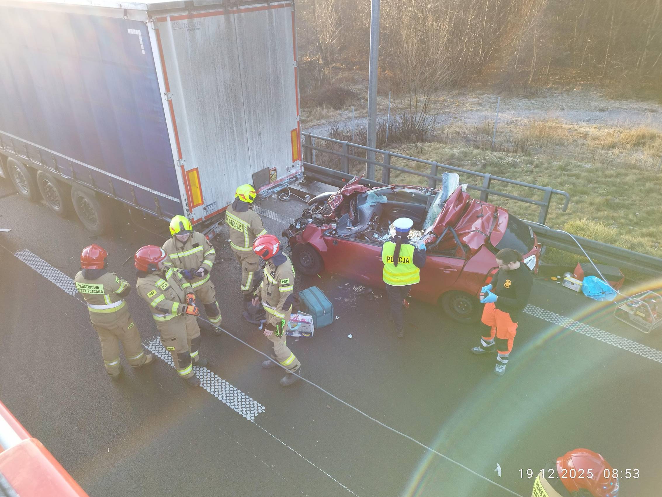 Do zdarzenia doszło po godzinie 8.00 na 349. kilometrze autostrady. Samochód osobowy najechał na tył pojazdu ciężarowego, wbijając się pod jego naczepę. Na miejsce natychmiast skierowano służby ratunkowe. Strażacy musieli użyć specjalistycznego sprzętu, aby wydobyć kierowcę z rozbitego auta.