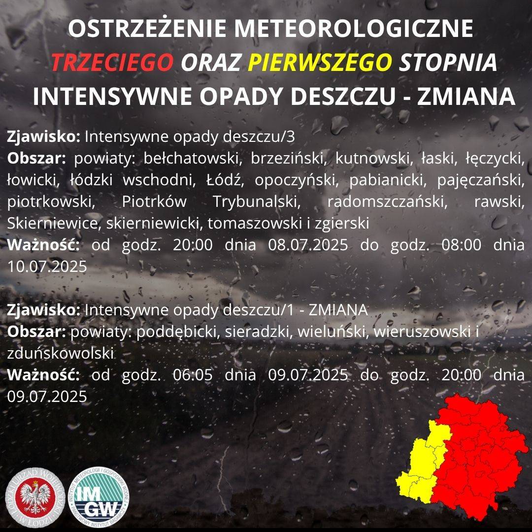Ostrzeżenie najwyższego, 3. stopnia przed ulewami objęte są powiaty: